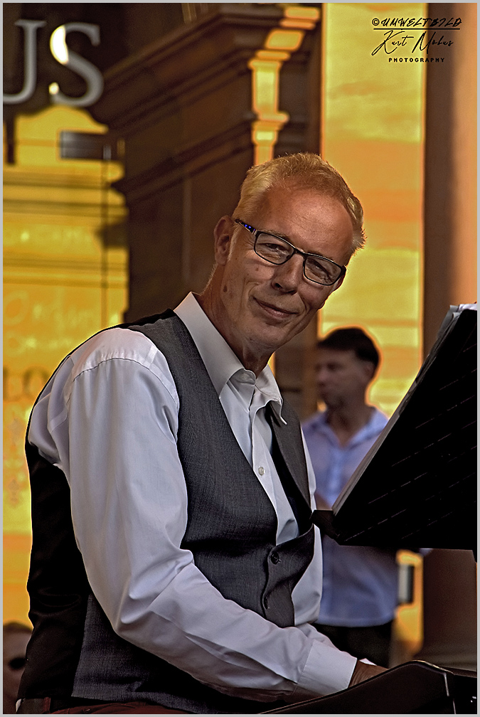 Der Boogiebaron Alexander von Wangenheim rockt den Wiesbadener Rathausplatz in der Abendsonne, begleitet von der Sängerin Naomi Kraft