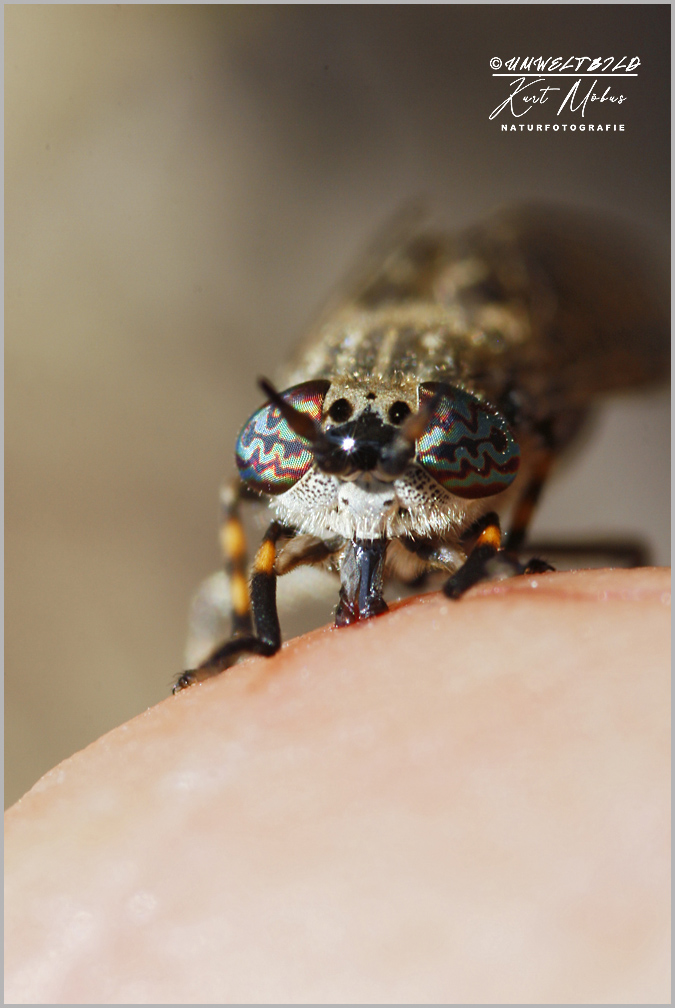 Die Regenbremse wird wegen ihrer bunten Augen auch Regenbogenbremse genannt.