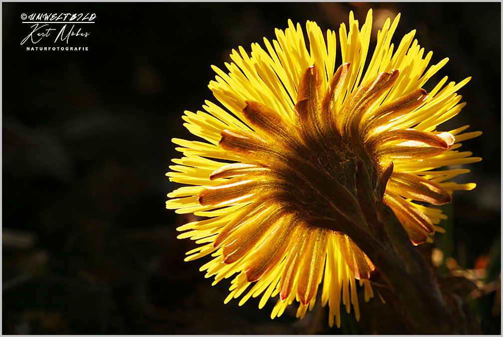 Im Gegenlicht von hinten gesehen, wird der Sonnenzeiger Huflattich selbst zur strahlenden Sonne