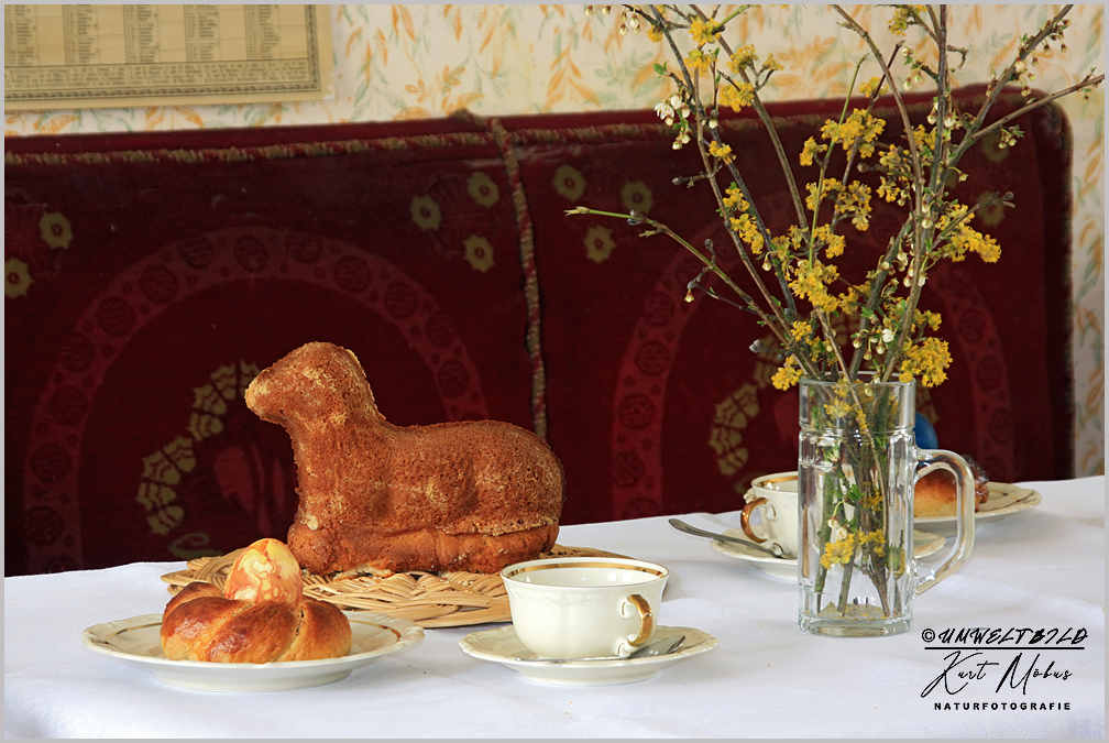 Das Innere der historischen Gebäude wird oft jahreszeitlich passend geschmückt, hier ein traditioneller Ostertisch aus den 20er Jahren.