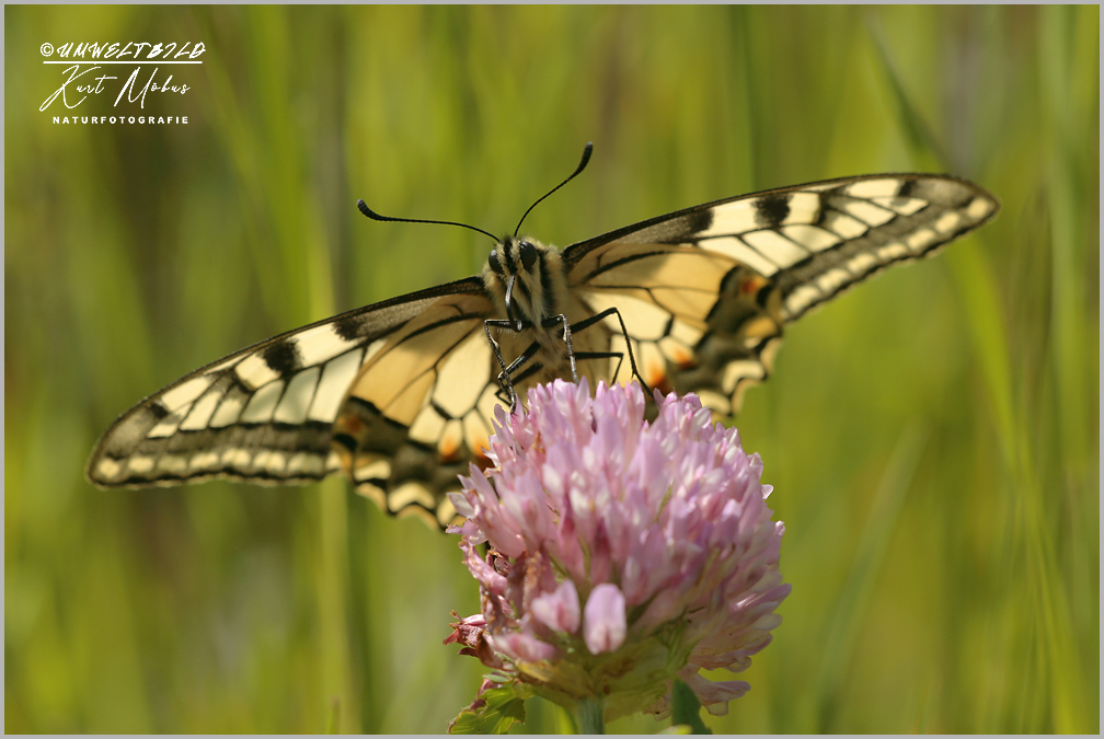 Schwalbenschwanz mal in ungewöhnlicher Perspektive, auf Rotklee saugend
