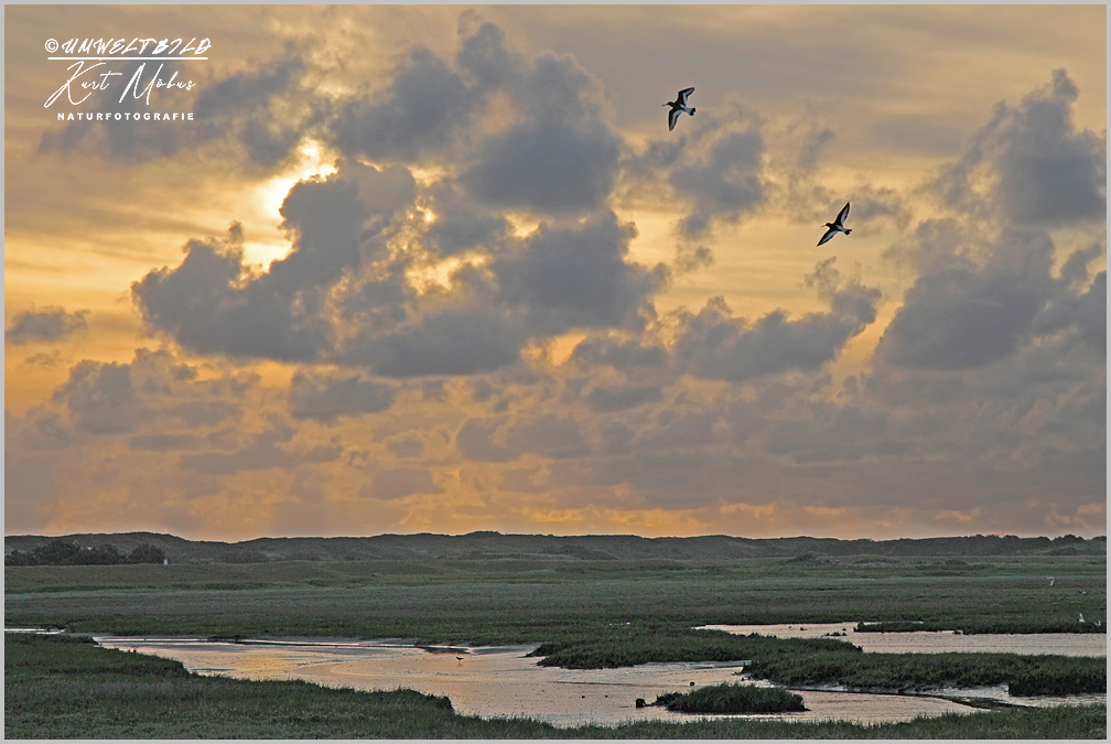 Als ich diese schöne Morgenstimmung in der Salzwiese nahe beim Westturm einfangen wollte, flogen mir plötzlich wie bestellt zwei Austernfischer ins Bild