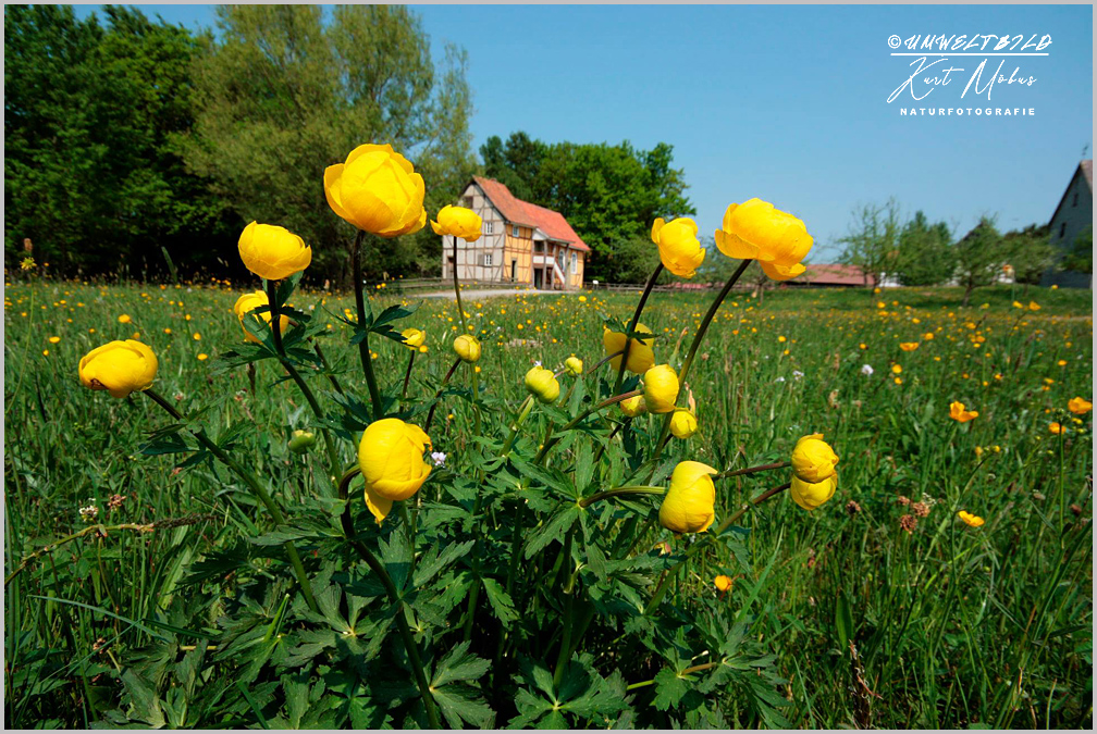 Die seltene Trollblume blüht auf der Extensivwiese vor der Synagoge von Nentershausen
